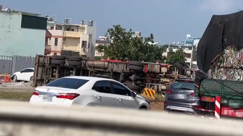 砂石車側翻到對向車道波及4車。圖/台視新聞台中/王英章 責任編輯/網路中心