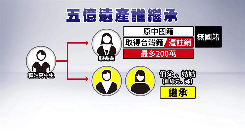 夏姓男子入獄又無法繼承遺產,被外界形容白忙一場!那五億的遺產將由誰繼承?原本五億遺產應該是要給賴姓高中生的母親,但是賴媽媽原本是中國籍,但後來取得台灣國籍卻又遭註銷,現在是無國籍狀態,最多可能只能分配到200萬,另外其他遺產,可能會由賴姓高中生名義上的伯父、姑姑,也就是他同父異母的兄弟姊妹繼承。