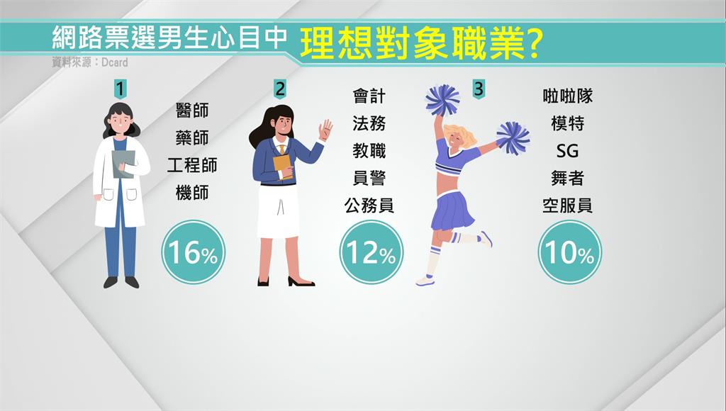 在網友列出的行業類別中,醫師/藥師/工程師/機師,以最高的比例16%拔得頭籌,其次是會計/法務/教職/員警及公務員佔比為12%,至於啦啦隊/模特兒/空服員等形象亮麗的職業,則獲得10%的男網友青睞。