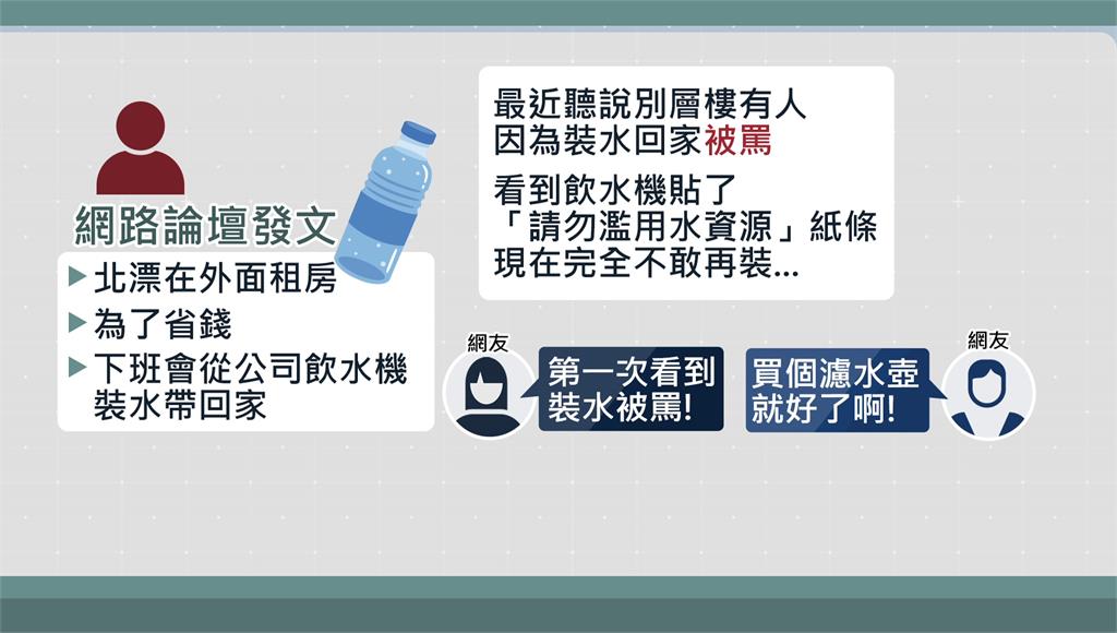 把公司的水裝回家,可能會出事嗎?一位小資北漂女在網路論壇PO文指出,自己在外面租房子,為了省錢,下班會從公司飲水機裝水帶回家,但最近聽說別層樓有人因為裝水回家被罵,且飲水機上被張貼「請勿濫用水資源」紙條,讓她不敢再裝。