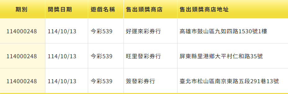 威力彩、今彩539派彩結果出爐。圖/台視新聞(資料畫面) 台灣彩券今(13)天公布第114000082期威力彩獎號,派彩結果出爐,頭獎槓龜無人中獎,下期頭獎保證2億;今彩539頭獎則是開出3注,每注獎金800萬。台彩公布本期今彩539的頭獎商店,位在高雄市鼓山區「好運來彩券行」、屏東縣里港鄉「旺里發彩券行」、台北市松山區「簽發彩券行」。本期今彩539頭獎開出三注。圖/翻攝自台彩官網責任編輯/蔡尚晉