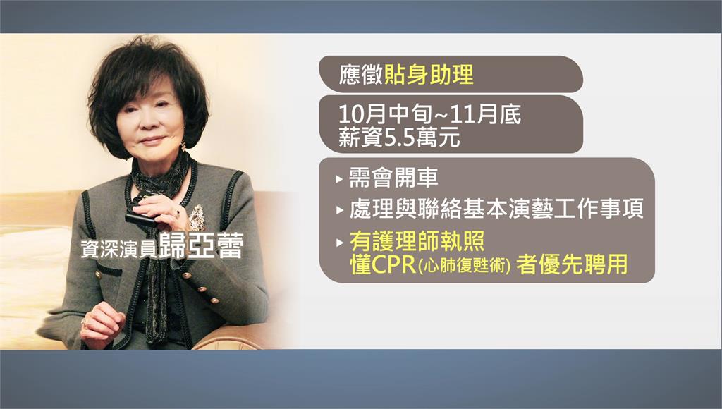 曾獲四座金馬獎等多個獎項肯定的影后歸亞蕾,高齡81歲仍堅持在第一線演出,和家人定居美國的她,近期悄悄返台接拍新片,更開出條件徵求短期助理,薪資為1.5個月5.5萬元,除了要處理工作上的事務,還需要具備護理師執照,並且懂CPR者優先聘用。