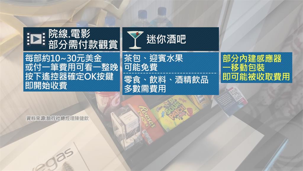 在國外飯店開電視看電影、吃零食鄧通常都要多付錢。圖/台視新聞旅行社也提醒,泰國某些飯店房間放的玻璃瓶裝水是不用錢,可冰箱裡頭的保特瓶裝水就可能要收70塊台幣。建議民眾一定要看清楚規定或打給飯店櫃台確認,以免突然被收費而壞了旅遊興致。
