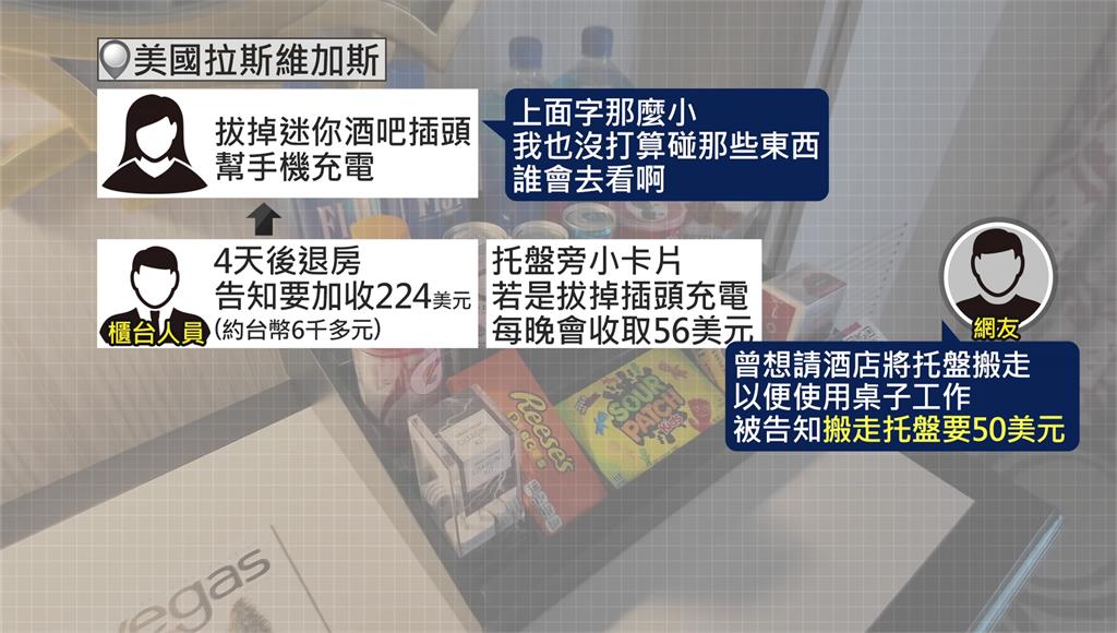 房間內有張小卡,註明若拔掉插頭充電每晚收56美元。圖/台視新聞女子相當生氣,直呼自己真的沒注意到托盤上「拔插頭充電每晚收56美元」的卡片,加上上面的字體又小,根本沒有看見。也有網友分享,曾經想請酒店把整個托盤搬走,比較好使用桌子工作,卻被告知若要搬走托盤要花50美元。