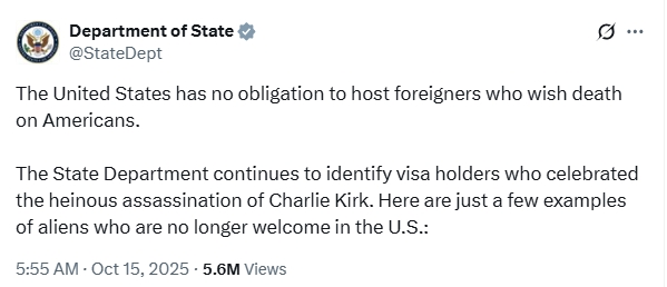 美國國務院在社群平台X發文,「美國沒有義務接待那些希望美國人死的外國人。美國國務院仍在確認那些慶祝查理·柯克慘遭暗殺的簽證持有者。」