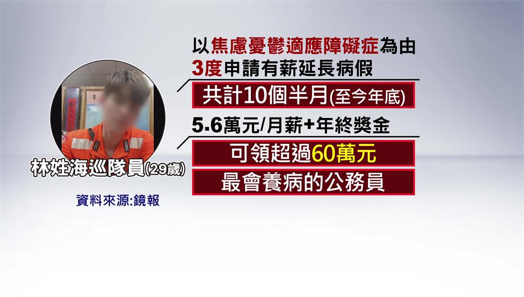 據平面媒體報導,林姓海巡隊員遭人指控,以「焦慮憂鬱適應障礙症」為由,3度向隊上申請有薪延長病假,合計到今年底共休了10個半月,期間每月領5.6萬元的月薪,若加上年終獎金,總共能領取超過60萬元的乾薪,堪稱最會養病的公務員。