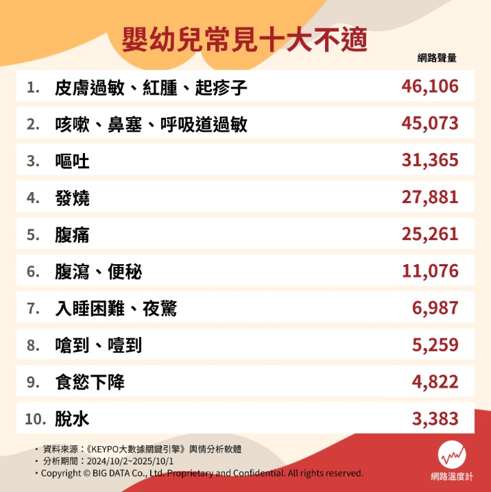 新手爸媽育兒挑戰多,最常遇到的就是寶寶不舒服又說不出口,從咳嗽、紅疹到腹瀉,狀況接二連三,讓父母手忙腳亂,為了幫助爸媽更快掌握育兒眉角,《網路溫度計DailyView》透過輿情分析軟體《KEYPO大數據關鍵引擎》,整理出小小孩十大常見不適情況,從呼吸道過敏、皮膚紅疹,到腸胃不適如便祕與腹瀉等,這些幾乎是每個家庭都要面對的「成長必修課」。