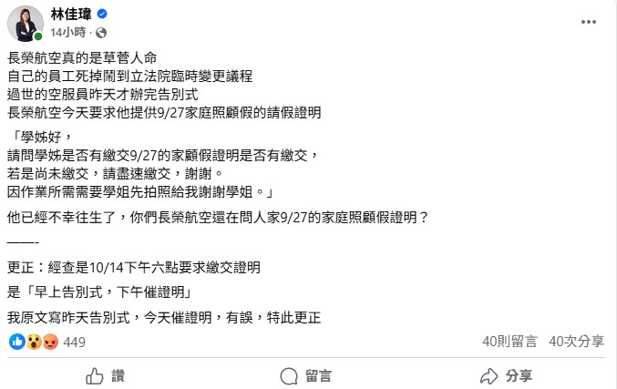 空服員抱病值勤後不幸身亡,沒想到家屬早上才剛完成告別式,下午就收到長榮航空訊息,要求提供家庭照顧假的證明,桃園市空服員職業工會顧問林佳瑋在臉書發文指出,這段訊息的內容是寫著,「學姊好,請問學姊是否有繳交9/27的家顧假證明,若是尚未繳交,請盡速繳交。因作業所需,需要學姐先拍照給我,謝謝學姐」。