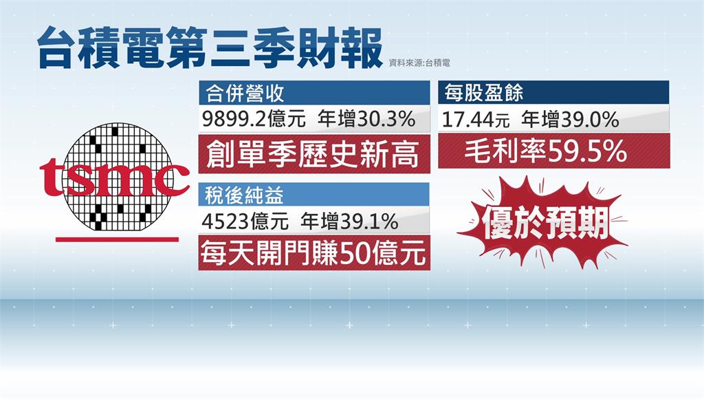 台積電公布第3季財報。圖/台視新聞另外台積電每股盈餘17.44元,毛利率也近六成,主要數據都優於預期。分析師就指出,在AI晶片的需求帶動之下,台積電應該都有機會持續成長,也能夠持續推升股價,