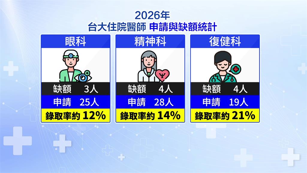 2026年台大住院醫師申請與缺額統計。圖/台視新聞從數據來看,「眼科」最為搶手,僅開出3個缺額,卻吸引25人申請,錄取率只有12%;相對冷門的則是「急診科」,錄取率高達百分之百,缺額與申請人數完全相符;受少子化影響的「婦產科」與「小兒科」缺額遠高於申請人數,錄取率突破150%。