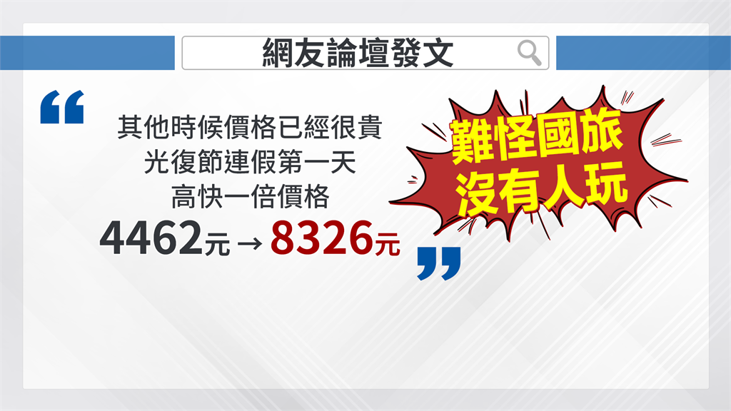 除此之外,下周迎來光復節連假,有網友發文提到住宿價格差很大,其他時候價格已經很貴,但在光復連假第一天價格快翻倍,從4000多元飆升到8300元。飯店價格浮動大,也難怪越來越多人不玩國旅,連續假期算一算CP值,寧願往國外跑。