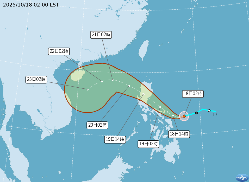 「風神」颱風路徑潛勢預報。圖/翻攝自中央氣象署針對今日白天的天氣概況,中央氣象署說明,今(18)天環境風場為偏東到東北風,基隆北海岸、宜蘭地區、大台北山區及恆春半島有局部短暫陣雨,花東地區及大台北平地也有零星降雨,其他地區為多雲到晴,午後嘉義以南地區及其他山區有零星短暫雷陣雨。