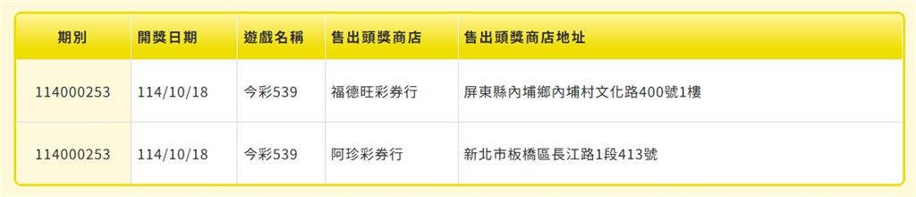今彩539派彩結果出爐。圖/台視新聞(資料畫面) 台彩今(18)日今彩539獎號開出02、17、32、35、38,晚間派彩結果出爐,頭獎開出2注,每注獎金800萬,分別從新北市板橋區長江路1段413號「阿珍彩券行」與屏東縣內埔鄉內埔村文化路400號1樓「福德旺彩券行」開出。今彩539頭獎開出兩注。圖/翻攝自台彩官網責任編輯/馮康蕙