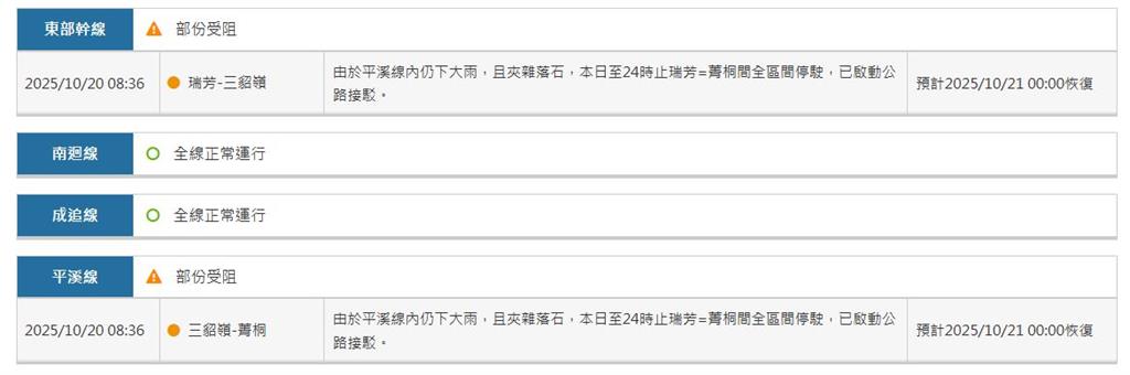 台鐵平溪線「瑞芳-菁桐」延長停駛至今24時。圖/台鐵官網 11:30更新台鐵平溪線今(20)天持續降雨,且夾雜落石,因此本日至24時「瑞芳到菁桐」路段全面停駛,平溪線暫停營運,同時啟動公路接駁。另外,中央氣象署發布豪雨特報,受到東北季風及颱風外圍環流影響,今天基隆北海岸、臺北市、新北市、桃園市、宜蘭縣,有局部大雨或豪雨,請民眾多加留意預防。台鐵「瑞芳-菁桐」因大雨+落石影響,暫停營運。圖/台鐵官網責任編輯/網路中心