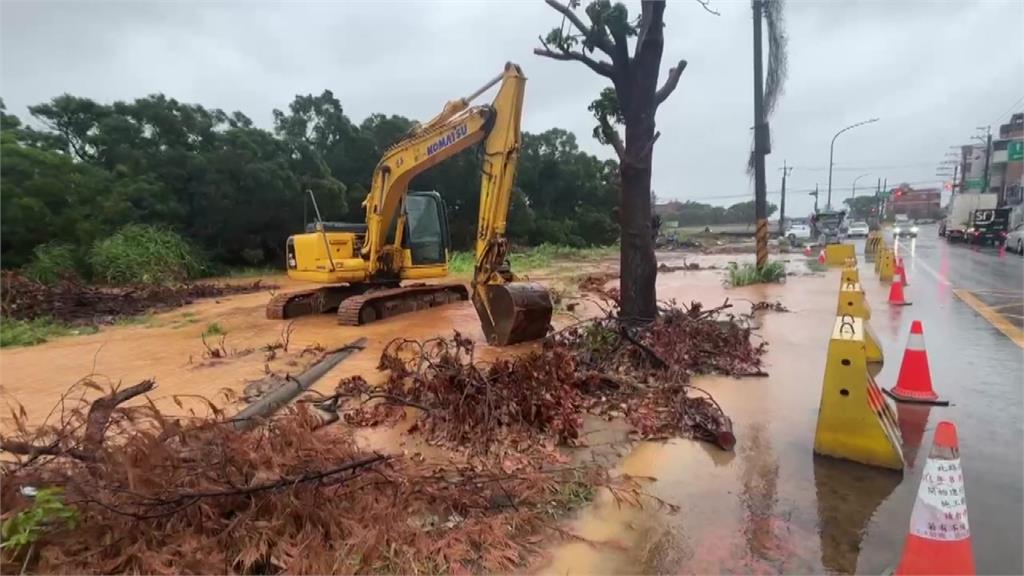 觀音區列二級淹水警戒,市府出動怪手協助排水。圖/台視新聞埔心里地區也出現淹水的情況,黃泥水一度淹至家門階梯半個高度。居民回憶,早上起床時水勢已經湧上門前,只能趕緊清理。「九點起來看到外面都淹大水,趕快喊人來幫忙。」