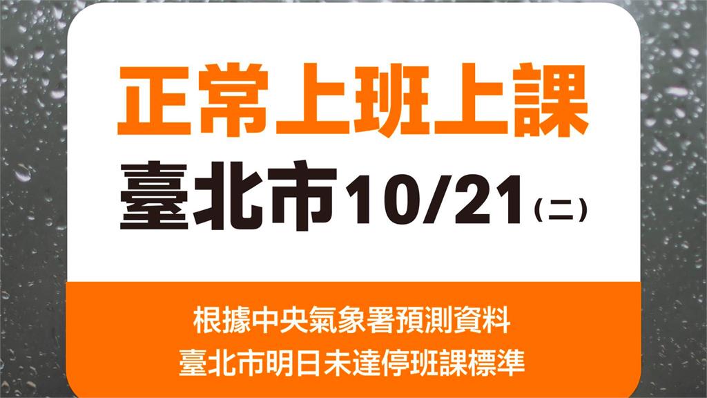 台北市:正常上班上課/格致國中、華岡藝校、文化大學遠距上班課;陽明山國小、平等國小、湖田國小、溪山國小、雙溪國小停班課。