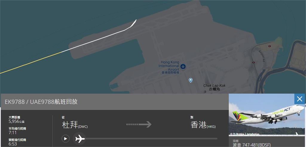 香港今(20)天凌晨傳出重大飛安事故,編號EK9788、由杜拜飛抵香港的阿聯酋航空波音747貨機在香港國際機場降落,疑似煞車失靈衝出跑道,撞到一輛地勤車,雙雙墜入大海中。雖然機上4名人員從逃生滑梯成功脫困,不過地勤車上2名工作人員送醫後仍不治身亡。