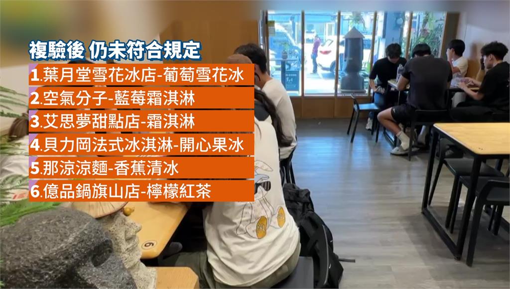 6店品項複驗後仍未符合規定。圖/台視新聞腸桿菌不僅存在飲品裡,冰品也有超標問題。有6間店經衛生局複驗後仍未符合規定,像是葉月堂的葡萄雪花冰、空氣分子藍莓霜淇淋、艾思夢霜淇淋、貝力岡開心果冰、那涼涼麵的香蕉清冰,以及億品鍋旗山店的檸檬紅茶。