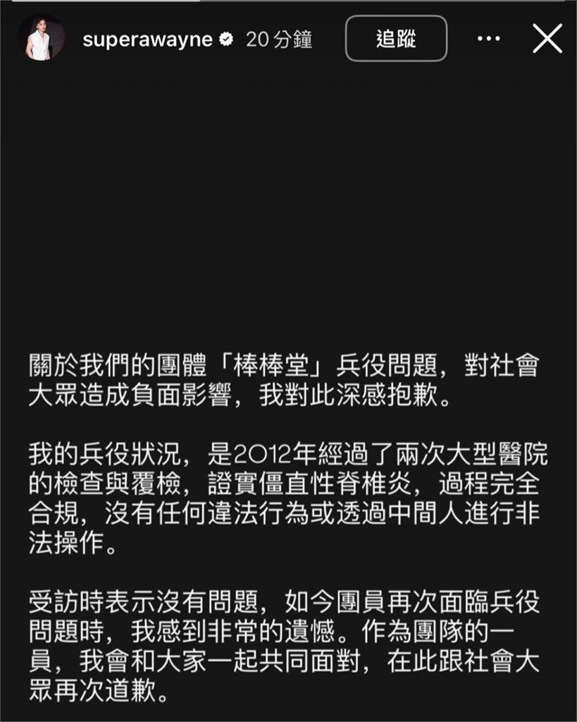 棒棒堂成員阿緯發聲道歉。圖/翻攝自Instagram@superawayne責任編輯/施佳宜