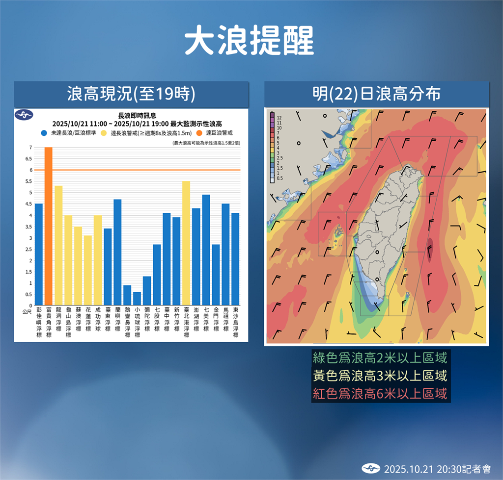 海象方面,沿海浪高普遍達3米以上,其中中部至北部海域浪高更可能達5至6米,提醒民眾避免前往海邊活動,並注意風浪與劇烈天氣帶來的潛在風險。