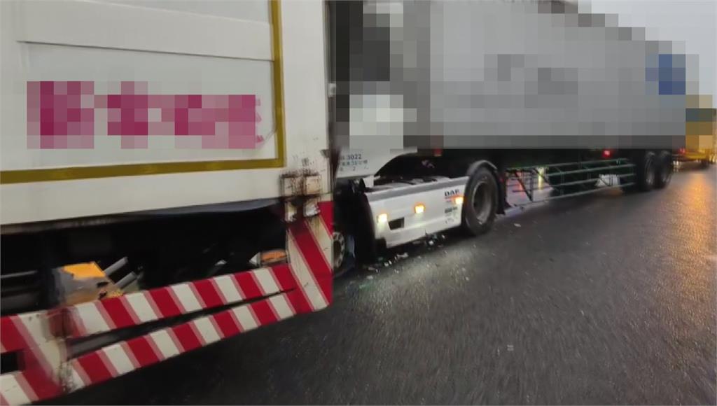多車連環追撞,共四輛車遭到波及。圖/台視新聞後方一輛白色大貨車見狀,立刻停車協助阻擋現場,沒想到現場雨勢過大、視線不佳,第四輛物流車煞車不及再度打滑追撞。物流車駕駛一度受困車內,經消防人員救出後送醫,所幸沒有生命危險。這起事故共波及四車,造成一死一傷,目前現場仍在排除中,雙向車道壅塞,詳細肇事原因仍待警方進一步釐清。