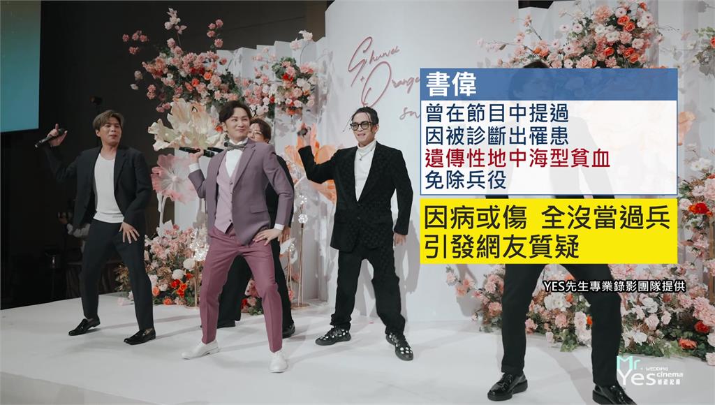 男團Energy又唱又跳16蹲,先前閃兵風波就有網友質疑,全員體能這麼好,但都免兵役,其中成員書偉曾在節目中提過,因被診斷出罹患「遺傳性地中海型貧血」,因此免除兵役;坤達也傳出2005年因自發性氣胸,做肺部導流手術。