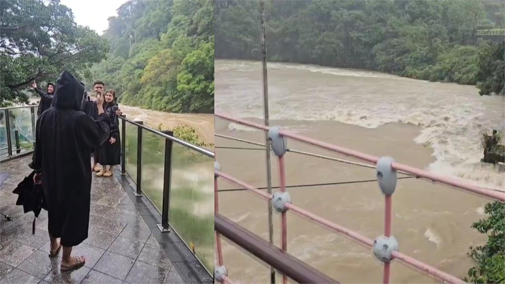 十分瀑布暴漲,不少外國遊客到此一遊。圖/台視新聞平溪線因強降雨停駛 台鐵:安全無虞再復駛