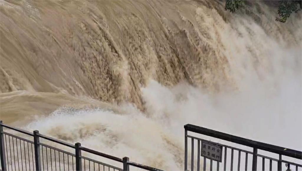 原本清澈的十分瀑布,如今被黃濁的泥水取代,轟隆隆地傾瀉而下,水氣夾雜著泥沙四濺,水勢驚人。