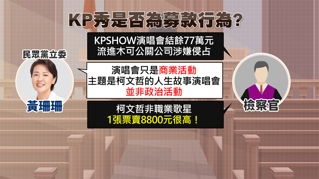 黃珊珊說柯文哲不希望她麻煩別人,檢方追問「別人」是誰。圖/台視新聞而引發爭議的KP秀,黃珊珊也說演唱會只是商業活動,主題是「柯文哲的人生故事」演唱會,並非政治活動,但也遭檢方反譏,「柯文哲非職業歌星藝人,1張票賣8800元很高」!