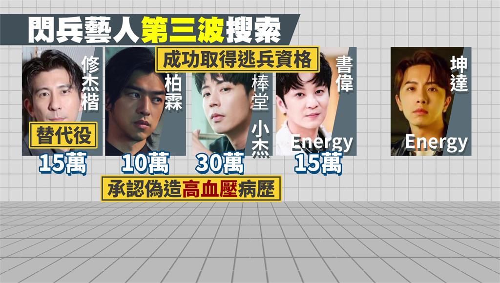 21日一早鎖定10人展開拘提,藝人包含陳柏霖、修杰楷、書偉、坤達及小杰等5人,除了坤達人在加拿大錄製節目沒有到案,其他人均坦承有找閃兵集團,以10-30萬不等價格偽造「高血壓病歷」。其中修杰楷因槍手出包複檢沒過,獲得「替代役」資格,另外3人則成功躲過兵役。不過被問是誰介紹的?4人卻疑似集體失憶,都說忘記了。