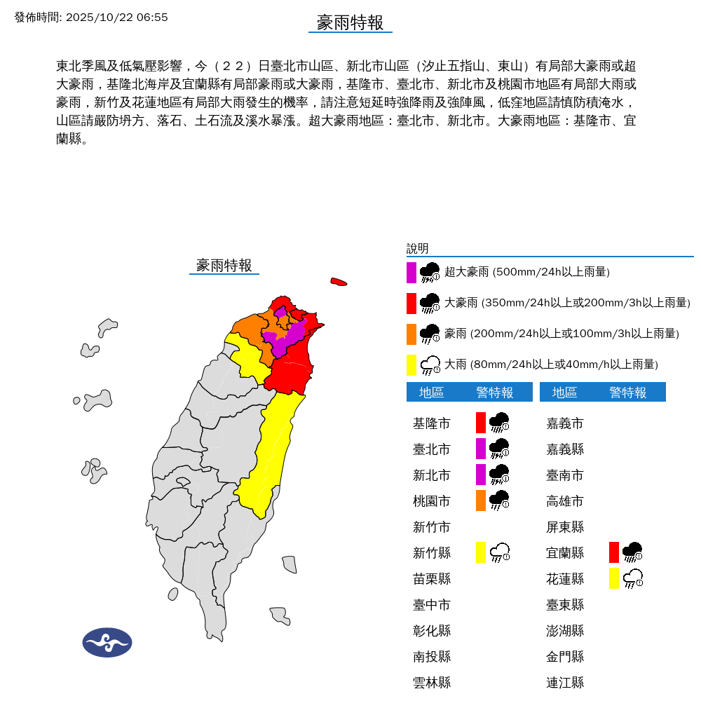 雙北發布超大豪雨特報,基宜大豪雨。圖/翻攝自中央氣象署氣象署說明,北部及東北部整天都是濕涼的天氣,氣溫介於22至24度左右,其他地區早晚也偏涼,低溫23至25度,白天高溫約28至32度。基隆北海岸、雙北山區及宜蘭地區應防範長時間強降雨,易有局部豪雨等級以上降雨發生,留意強降雨及伴隨的雷擊、強陣風。
