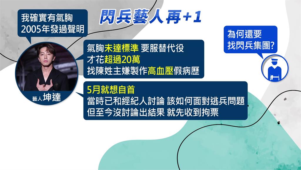 而坤達偵訊時表示自己確實有氣胸,2005年就曾發過聲明,但為何還要找閃兵集團?坤達坦承疑似氣胸「未達標準」,要服替代役,才花超過20萬元找上陳姓主嫌幫忙製作假的高血壓病歷。他也提到5月時就想自首,當時已經和經紀人討論該如何面對閃兵問題,但至今沒討論出結果,反倒先收到拘票。