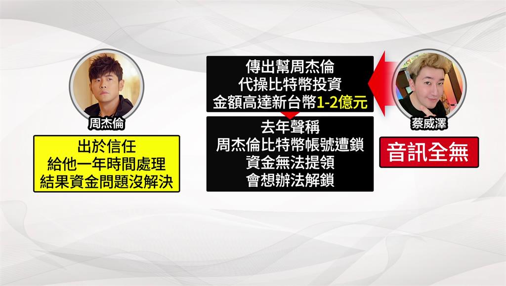周杰倫與蔡威澤兩人友情恐怕變調,周杰倫在IG限動上發出尋人啟事,更罕見動怒說,「這傢伙消失一陣子了,給一堆藉口,再不出現你就完了!」根據周刊報導,蔡威澤疑似幫周杰倫代操比特幣投資,金額高達新台幣1至2億元,但蔡威澤在去年聲稱周杰倫的比特幣帳號遭鎖,資金無法提領,他會想辦法解決,後來周杰倫出於信任,給他一年時間處理,結果資金問題沒解決,蔡威澤還音訊全無,人間蒸發。