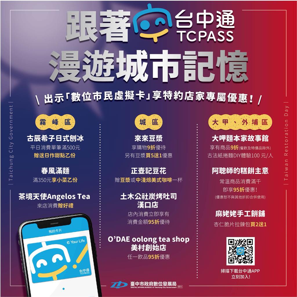 光輝十月連假不間斷!在中秋節、雙十節過後,台中市政府數位發展局邀請民眾把握連假遊台中,迎接「光復節連假」,打開《台中通TCPASS》APP,一起走進老街巷弄,重溫城市記憶。精選大甲、外埔、霧峰及中、西區等富含歷史人文氣息的街區店家,只要出示數位市民虛擬卡,即可享受專屬折扣與好禮,在懷舊氛圍中體驗古早味與文青風的完美交融。