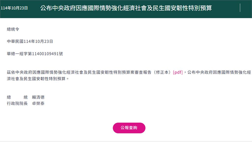 總統府正式公告韌性特別預算案。圖/翻攝自總統府(資料畫面) 立法院三讀通過「中央政府因應國際情勢強化經濟社會及民生國安韌性特別預算案」,共編列5500億,其中包含全民普發現金1萬元的2360億。總統府今(23)日收到立院咨文後正式公告,代表中央普發1萬作業正式展開,民眾有望在11月上旬就領到。總統府說明,總統府於今日下午15時收到立法院咨請總統公布的咨文後,待總統結束論壇公開行程返府,已於稍早18時15分完成簽署公布。總統府公告韌性特別預算案。圖/翻攝自總統府責任編輯/洪季謙