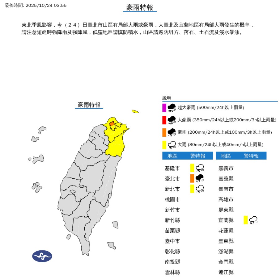 氣象署針對4縣市發布豪大雨特報,台北市為「豪雨地區」,基隆市、新北市、宜蘭縣為「大雨地區」。桃園及花蓮地區有短暫陣雨,並有局部大雨發生的機率,竹苗、台東地區及中南部山區有局部短暫陣雨,其他地區為多雲的天氣,連日降雨,山區嚴防坍方、落石及溪水暴漲,提醒民眾外出務必小心路況,注意安全。
