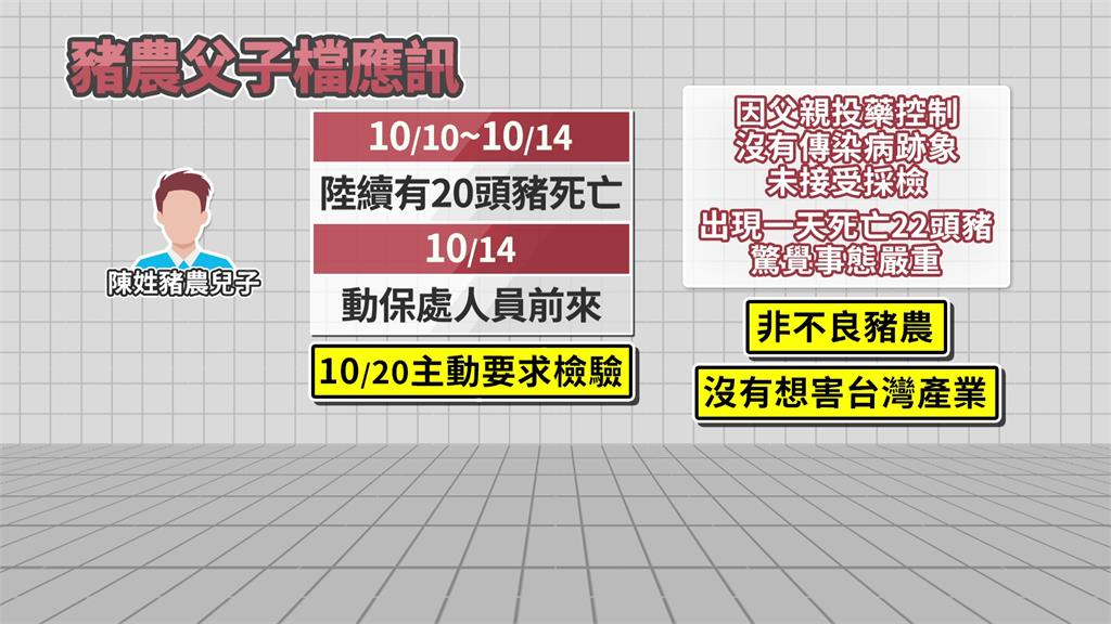 台中傳出疑似非洲豬瘟案例,事發養豬場的陳姓父子23日下午以證人身分前往地檢署說明,檢方訊後諭知請回。豬農兒子表示,10日至14日間陸續有20頭豬死亡,父親先以藥物控制,當時並沒有傳染病跡象,因此未採檢。沒想到幾天後豬隻大量死亡,光一天就死了22頭,於20日主動要求檢驗,強調「不是不良豬農,也沒有想要害台灣產業」。