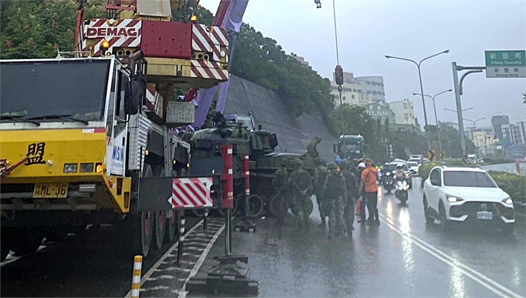 國軍勇虎戰車居然卡在路上!今(24)天清晨5點多陸軍第六軍團進行機動任務,行經竹北市中華路南下66公里處、明新科技大學前,一輛勇虎戰車在下坡路段時因履帶突然斷裂,卡在彎道動彈不得。由於戰車體型龐大,現場引起不少民眾注目,所幸軍方立即出動大型吊車排除,未釀成任何交通事故或人員傷亡。軍方出動大型吊車救援。圖/台視新聞責任編輯/網路中心