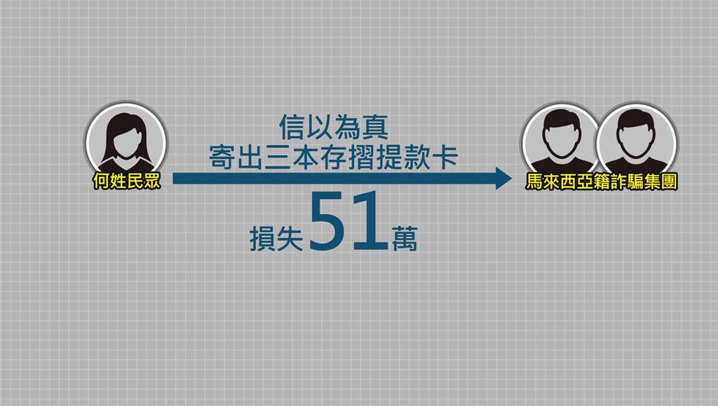 何姓民眾一時慌亂,信以為真,將三本存摺及提款卡寄出,導致損失約51萬元,最終警方循線逮捕兩名女車手,均為馬來西亞籍。