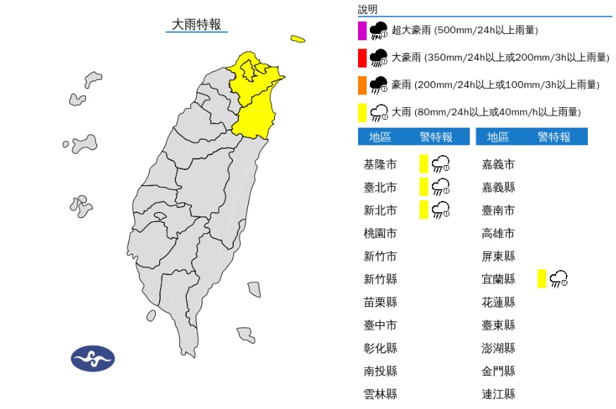 氣象署針對「4縣市」發布大雨特報。圖/翻攝自中央氣象署今天受東北季風影響,基隆北海岸、大臺北山區、宜蘭地區普遍有短暫雨,桃竹苗、花東及恆春半島也有局部短暫雨,其他地區為多雲天氣,午後南部地區及中部山區則有局部短暫陣雨。