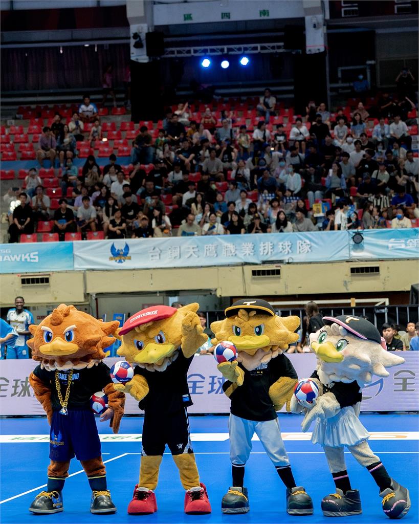 「雞柳條」家族到齊開球助陣。圖/翻攝自FB@TPVL 台灣職業排球聯盟台鋼天鷹隊長陳建禎賽後直呼「贏球真的太爽了」!他強調這場勝利是球隊與全體球迷共同努力的成果,也呼籲球迷之後繼續進場支持球隊,他進一步指出,本場比賽能夠取勝的關鍵在於舉球員陳玠廷靈活的調度,使每位攻擊手都發揮出色,而陳玠廷個人單場舉球到位率達53.3%,也獲選為今天單場最佳球員。