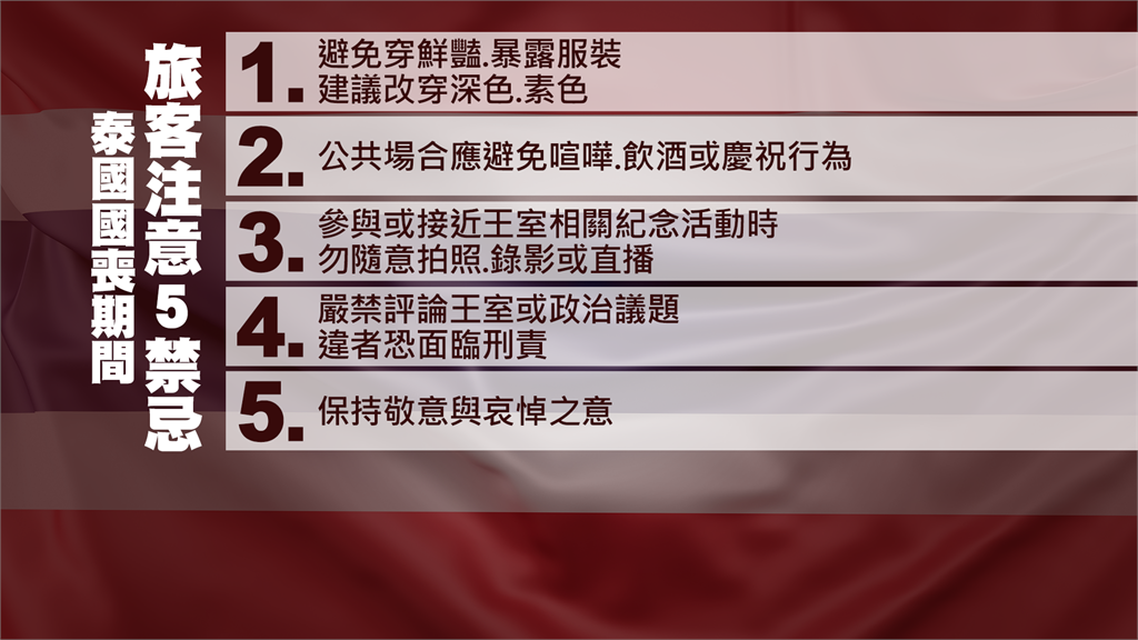 泰國進入國喪期,5大地雷要避免。圖/台視新聞航空顧問集團代表法比安指出,原則上如果是觀光客去,最簡單的就是親眼所見就好,不要隨便拍照,拍到國王的時候也要千萬留意,需在要求的拍攝角度跟範圍之內再拍攝,不要像狗仔一樣拍人家的私生活,這是明令禁止的,即便沒有在國喪期間,只要講到對王室不利的話就會被警告或起訴。