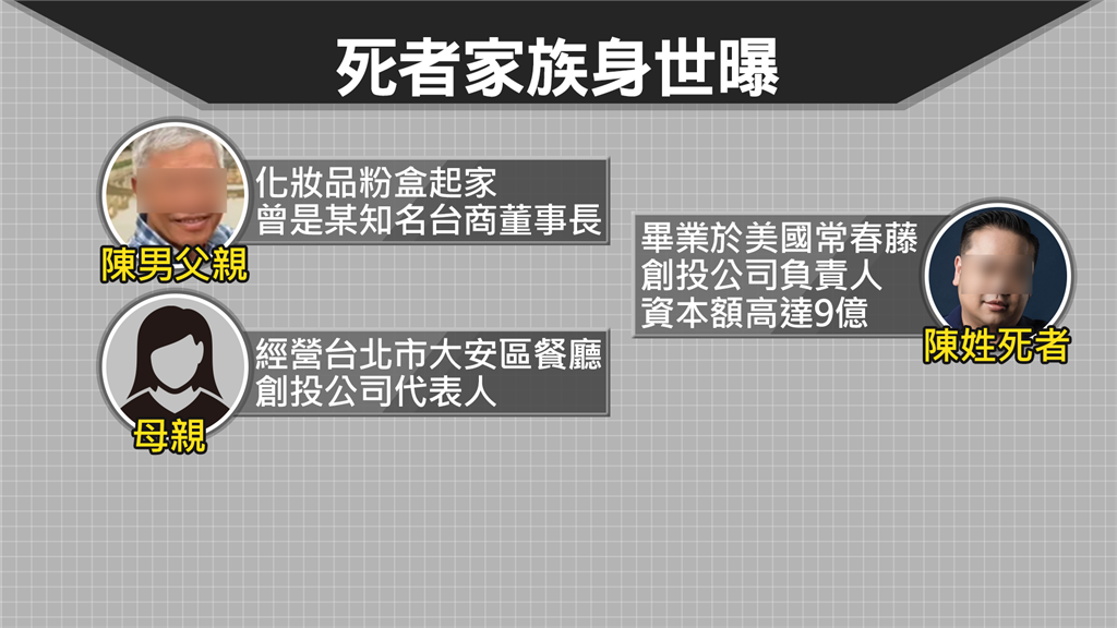 而隨後陳姓男死者家世背景也曝光,父親以「化妝品粉盒」起家,曾是某知名台商的董事長,全盛時期年營收約新台幣60億;陳姓死者則畢業於美國常春藤,還是資本額高達9億創投公司的負責人,也投資餐飲事業,時常在臉書分享遊山玩水日常,過去曾有毒品前科。