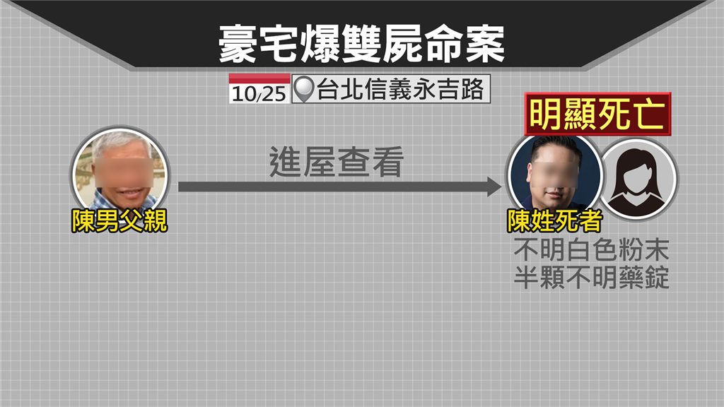 台北市信義區一棟豪宅大樓昨晚驚傳一起雙屍命案,一名37歲陳姓男子和一名25歲曾女倒臥在住處客廳,兩人都沒有生命跡象,桌上還留有不明的白色粉末;今(26)天下午雙方家屬都來到二殯相驗,而死者背景曝光,生前是某創投公司負責人,父親則是以「化妝品粉盒」起家、事業版圖遍及多國的知名台商董事長,家世顯赫。