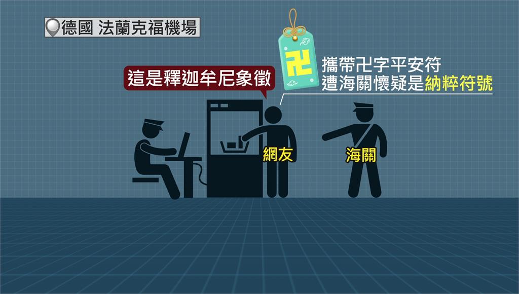 遭海關誤認佛教「卍」字為納粹符號,男子拆掉平安符才順利通關。圖/台視新聞製圖出國在外各地文化差異大,也有旅遊達人分享類似案例。旅行社總經理陳健欽表示,他曾在中國大陸出差時,身上佩戴了一顆排灣族的琉璃珠,被海關問該顆琉璃珠的符號代表什麼,並要求他拿掉,於是他就將它取下放進包裡,避免引發衝突。