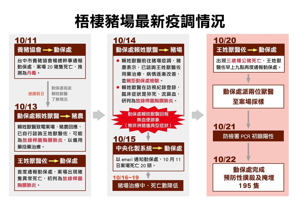台中梧棲豬場最新疫調。圖/非洲豬瘟前進應變所提供鄭照新說明,時序回顧至10/11至10/22,10/11養豬協會楊總幹事就接獲案場當天有20頭豬死亡,通知推測為單獨事件,類似於豬隻蜂窩性組織炎,動保處獲報後派市府賴姓技佐獸醫了解狀況。