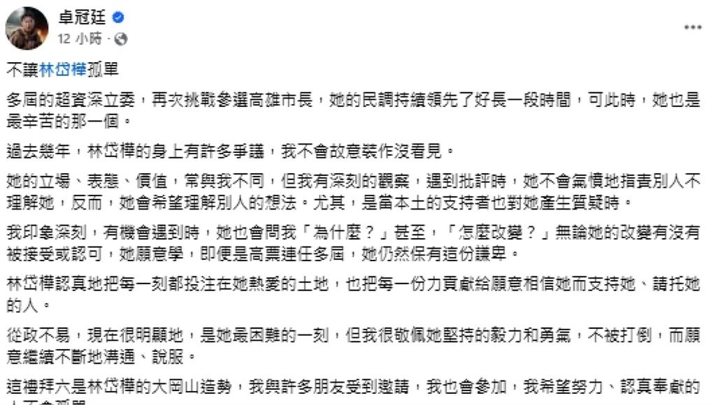 正國會卓冠廷發文挺林岱樺。圖/翻攝自FB@卓冠廷2026高雄市長潛在對手們紛紛回應,民進黨立委邱議瑩提到,現在有派系的領導人直接公然在臉書上面號召,身為一個從政者,國家利益、台灣利益永遠要擺在第一位;民進黨立委許智傑則說,各派系有自己的立場和想法,都尊重。