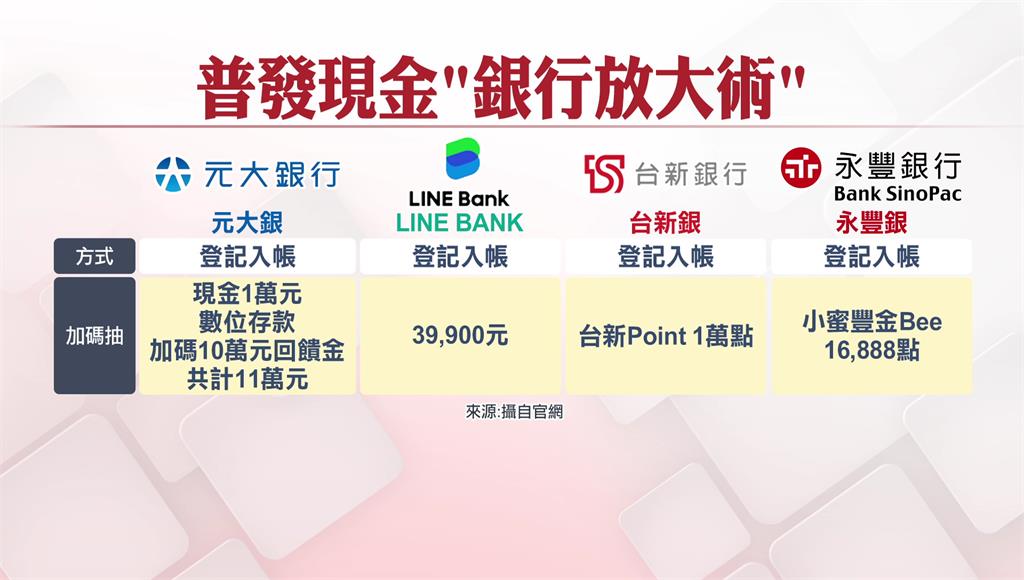 也有銀行選擇加碼抽回饋金。圖/非凡新聞另一類加碼則是現金加上回饋,像是元大銀行用「登記入帳」方式,最多能放大11倍;LINE BANK抽39900元現金;台新銀以及永豐銀,分別抽一千點台新點和16888點小蜜豐金。