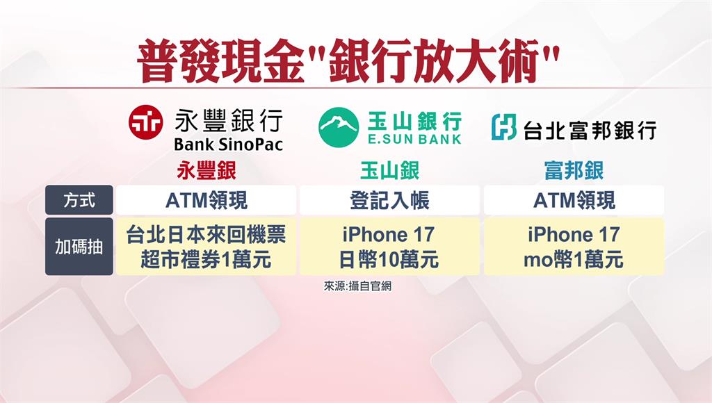 各銀行紛紛祭出加碼優惠,像是可抽機票、iPhone 17。圖/非凡新聞普發現金一萬元,各家銀行搶著推出加碼優惠,主要有兩大類,像是直接加碼送禮物,永豐銀抽台北日本沖繩雙人來回機票還有超市禮券1萬元;玉山銀則是抽iPhone 17以及日幣十萬元;北富銀也加入戰局,同樣也是加抽iPhone 17。