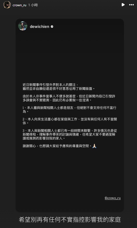 前啦啦隊女星粿粿遭丈夫范姜彥豐指控,與藝人王子發生婚內出軌,事情在網上持續延燒,且因為范姜提到妻子是在美國行回來後態度丕變,當時同行的藝人簡廷芮也被捲入這場風波,遭疑知情且幫忙隱瞞,甚至是與王子曖昧,對此簡廷芮透過社群IG發出3點聲明,其老公賴冠儒也強硬發聲,要大家別再影響自己的家庭。